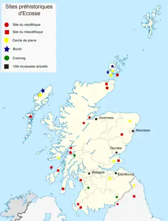 La plupart des villages du Néolithique sont faits de bois, ce qui explique la faible quantité de découvertes les concernant. En revanche, une douzaine de sites où des structures de pierre ont été repérées ont pu être identifiés[2]. Les restes, témoins de cette époque se trouvent principalement dans les îles Orcades, riches en sites néolithiques remarquablement conservés grâce à l’utilisation de pierres locales que l’on trouve sur la côte en blocs prêts à être directement assemblés.