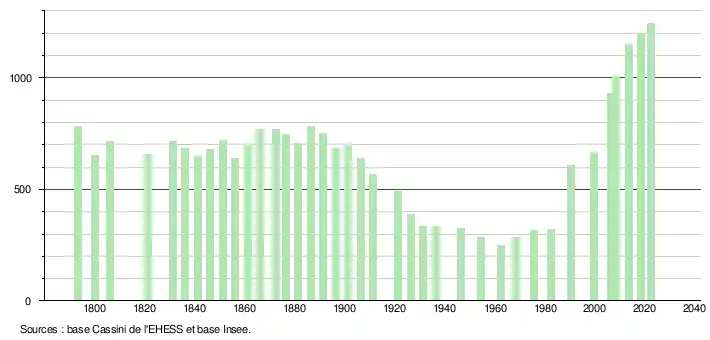 L'évolution du nombre d'habitants est connue à travers les recensements de la population effectués dans la commune depuis 1793. Pour les communes de moins de 10 000 habitants, une enquête de recensement portant sur toute la population est réalisée tous les cinq ans, les populations de référence des années intermédiaires étant quant à elles estimées par interpolation ou extrapolation[16]. Pour la commune, le premier recensement exhaustif entrant dans le cadre du nouveau dispositif a été réalisé en 2008[17].