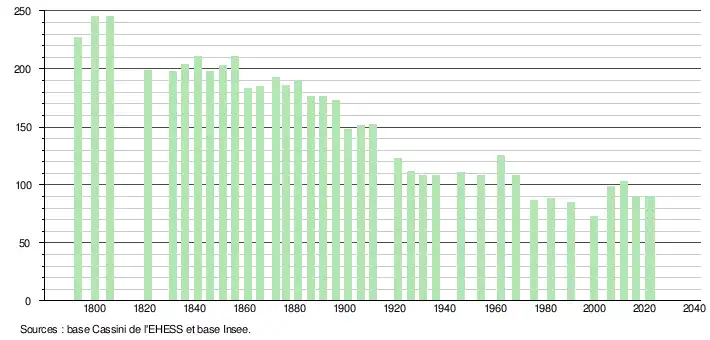 L'évolution du nombre d'habitants est connue à travers les recensements de la population effectués dans la commune depuis 1793. Pour les communes de moins de 10 000 habitants, une enquête de recensement portant sur toute la population est réalisée tous les cinq ans, les populations de référence des années intermédiaires étant quant à elles estimées par interpolation ou extrapolation[17]. Pour la commune, le premier recensement exhaustif entrant dans le cadre du nouveau dispositif a été réalisé en 2006[18].