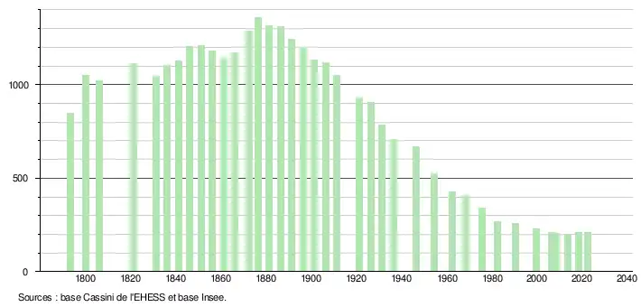 L'évolution du nombre d'habitants est connue à travers les recensements de la population effectués dans la commune depuis 1793. Pour les communes de moins de 10 000 habitants, une enquête de recensement portant sur toute la population est réalisée tous les cinq ans, les populations de référence des années intermédiaires étant quant à elles estimées par interpolation ou extrapolation[13]. Pour la commune, le premier recensement exhaustif entrant dans le cadre du nouveau dispositif a été réalisé en 2008[14].