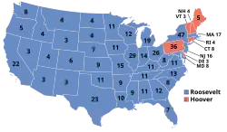 L'adversaire de Roosevelt au scrutin général était le président républicain en exercice Herbert Hoover. Dans une campagne qui le mena d'un bout à l'autre du pays, Roosevelt promit d'accroître le rôle du gouvernement dans l'économie et d'abaisser les droits de douane dans le cadre d'un programme connu sous le nom de New Deal (« Nouvelle donne »). De son côté, Hoover affirma que l'effondrement de l'économie était en grande partie dû à des causes extérieures et il accusa Roosevelt de s'ériger en apôtre de la lutte des classes. Le président, dont le marasme économique avait déjà fait chuter la popularité, vit ses chances de réélection se réduire comme peau de chagrin à la suite de la marche de la Bonus Army qui se solda par la répression brutale de plusieurs milliers d'anciens combattants venus réclamer une revalorisation de leur pension[2].