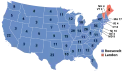 Le jour de l'élection, Roosevelt arriva en tête avec 472 votes de grands électeurs (sur 531) et 57,4 % du vote populaire, ce qui fit de lui le premier démocrate à remporter la majorité des suffrages populaires depuis 1876 ; en outre, il réalisa le plus gros score d'un candidat démocrate depuis la création du parti en 1828. Lors des élections législatives qui se déroulèrent à la même période, les démocrates prirent le contrôle du Sénat et consolidèrent leur majorité à la Chambre[2]. Même si les sudistes conservateurs étaient surreprésentés parmi les chefs du parti au Congrès, près de la moitié des élus du 73e Congrès ne siégeaient que depuis 1930 et nombre de ces parlementaires étaient désireux de lutter efficacement contre la Grande Dépression, même au prix d'une remise en cause de l'orthodoxie politique qui avait prévalu jusqu'alors[3].