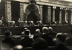Roosevelt fut investi en tant que 32e président des États-Unis le , sous l'autorité du juge en chef Charles Evans Hughes[4]. Dans son discours inaugural, Roosevelt attribua la responsabilité de la crise aux banquiers et aux financiers, à la quête effrénée du profit et au ressort fondamentalement égoïste du capitalisme :