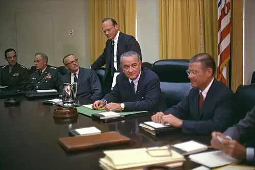 Pierre Salinger, qui avait été nommé par Kennedy au poste de porte-parole de la Maison-Blanche, démissionna en et fut remplacé par George Reedy, un fidèle de Johnson. Horace Busby servit essentiellement comme rédacteur de discours et analyste politique. Bill Moyers était le plus jeune membre de l'administration Johnson et se vit confier à temps partiel la rédaction de discours et la planification de l'emploi du temps du président[19]. Il joua un rôle-clé dans la préparation du programme législatif de la Grande société en 1964 et fut, la même année, le principal architecte de la campagne présidentielle de Johnson. À la suite de la démission de Jenkins en , Moyers devint le chef de cabinet officieux de la Maison-Blanche jusqu'en 1966 et remplit également les fonctions d'attaché de presse de à [20]. Les autres membres notables du personnel étaient Jack Valenti, George Christian, Joseph A. Califano, Jr., Richard N. Goodwin et W. Marvin Watson[21]. Johnson surnommait ses assistants « les hommes à la triple menace »[22] en raison de leur loyauté et de leur éclectisme.