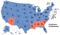 Le , le président Johnson signa le Civil Rights Act de 1964. La légende raconte qu'en posant son stylo, Johnson déclara à l'un de ses assistants : « nous avons perdu le Sud pour une génération », anticipant une réaction hostile des Blancs du Sud contre le Parti démocrate[60]. La loi interdisait désormais la ségrégation raciale dans les lieux publics ainsi que la discrimination à l'emploi fondée sur le sexe ou la race et renforçait les pouvoirs d'intervention du gouvernement fédéral en matière de discrimination sexiste ou raciale à l'embauche[61].