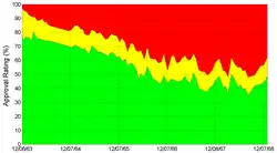 Un sondage Gallup réalisé en montrait que 52 % de la population désapprouvait la gestion du conflit vietnamien par Johnson[135]. Alors que la cote de popularité du président avait dépassé la barre des 70 % au milieu de l'année 1965, deux ans plus tard, 66 % des personnes interrogées disaient avoir perdu confiance dans la capacité du président à gouverner[136]. Après l'incident du Century Plaza Hotel, les apparitions publiques de Johnson se firent de plus en plus rares, le plus souvent dans des endroits sécurisés comme des bases militaires[137]. Persuadé que le mouvement d'opposition à la guerre était infiltré par des communistes, Johnson donna son feu vert à l'opération CHAOS, un projet d'espionnage interne confié à la CIA et mené en dehors de toute procédure légale, mais cette dernière ne déboucha sur aucun élément probant[138].