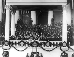 Harding fut assermenté en tant que président le , devant le portique est du Capitole. Le serment présidentiel fut administré par le juge en chef Edward Douglass White et Harding utilisa la Bible utilisée lors de la première investiture de George Washington en 1789. Ce fut la première fois qu'un président se rendit en automobile à son inauguration[22]. Dans son discours, Harding évoqua de nouveau les thèmes qu'il avait abordés au cours de sa campagne :