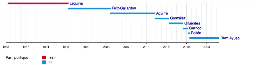 Depuis la création de ce poste, le , il a été occupé par huit personnalités différentes. Le socialiste Joaquín Leguina détient, avec douze ans de mandat, le record de longévité, tandis qu'Esperanza Aguirre a été la première femme à en être titulaire.