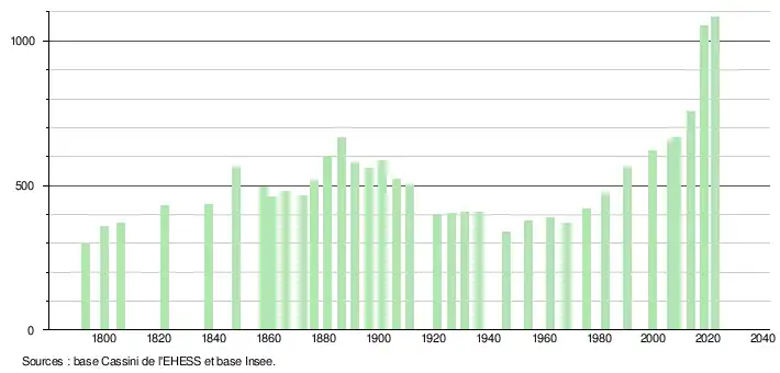 L'évolution du nombre d'habitants est connue à travers les recensements de la population effectués dans la commune depuis 1793. Pour les communes de moins de 10 000 habitants, une enquête de recensement portant sur toute la population est réalisée tous les cinq ans, les populations de référence des années intermédiaires étant quant à elles estimées par interpolation ou extrapolation[12]. Pour la commune, le premier recensement exhaustif entrant dans le cadre du nouveau dispositif a été réalisé en 2008[13].