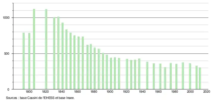 - ↑ Dans le tableau des recensements et le graphique, par convention dans Wikipédia, le principe a été retenu, pour les populations légales postérieures à 1999 de n’afficher dans le tableau des recensements et le graphique que les populations correspondant à l'année 2006, première population légale publiée calculée conformément aux concepts définis dans le décret no 2003-485 du 5 juin 2003, et les années correspondant à une enquête exhaustive de recensement pour les communes de moins de 10 000 habitants, ainsi que la dernière population légale publiée par l’Insee.