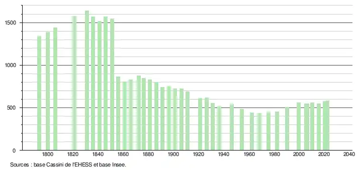 L'évolution du nombre d'habitants est connue à travers les recensements de la population effectués dans la commune depuis 1793. Pour les communes de moins de 10 000 habitants, une enquête de recensement portant sur toute la population est réalisée tous les cinq ans, les populations de référence des années intermédiaires étant quant à elles estimées par interpolation ou extrapolation[23]. Pour la commune, le premier recensement exhaustif entrant dans le cadre du nouveau dispositif a été réalisé en 2005[24].