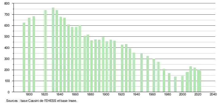 L'évolution du nombre d'habitants est connue à travers les recensements de la population effectués dans la commune depuis 1793. Pour les communes de moins de 10 000 habitants, une enquête de recensement portant sur toute la population est réalisée tous les cinq ans, les populations de référence des années intermédiaires étant quant à elles estimées par interpolation ou extrapolation[15]. Pour la commune, le premier recensement exhaustif entrant dans le cadre du nouveau dispositif a été réalisé en 2005[16].