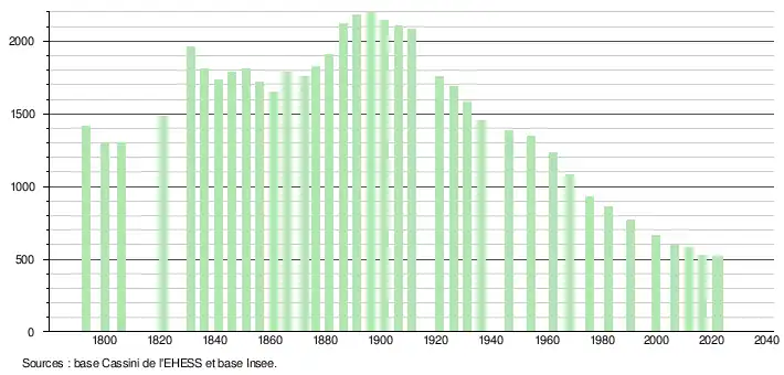 L'évolution du nombre d'habitants est connue à travers les recensements de la population effectués dans la commune depuis 1793. Pour les communes de moins de 10 000 habitants, une enquête de recensement portant sur toute la population est réalisée tous les cinq ans, les populations de référence des années intermédiaires étant quant à elles estimées par interpolation ou extrapolation[25]. Pour la commune, le premier recensement exhaustif entrant dans le cadre du nouveau dispositif a été réalisé en 2006[26].