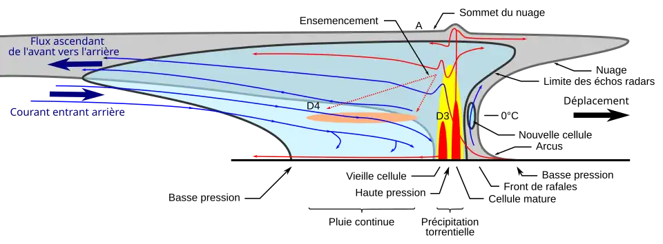 Au cours de la journée, lorsque le sol est chauffé par le soleil, l’air emprisonné sous cette inversion se réchauffe encore plus et peut également devenir plus humide du fait de l’évaporation. Si la zone d’inversion est localement érodée par des mélanges avec la couche inférieure ou si des phénomènes à grande échelle la soulèvent en bloc (front froid ou front de point de rosée[14] par exemple), la couche de surface devenue très instable jaillit violemment à certains endroits[15]. L’air à la surface du sol s’écoule alors horizontalement vers ces points d’éruption et forme de hauts nuages d’orage.