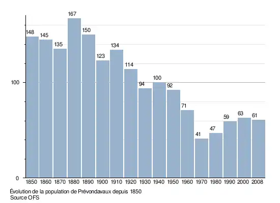 Selon l'Office fédéral de la statistique, Prévondavaux compte 97 habitants en 2023[1]. Sa densité de population atteint 54 hab./km2.