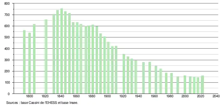 L'évolution du nombre d'habitants est connue à travers les recensements de la population effectués dans la commune depuis 1793. Pour les communes de moins de 10 000 habitants, une enquête de recensement portant sur toute la population est réalisée tous les cinq ans, les populations de référence des années intermédiaires étant quant à elles estimées par interpolation ou extrapolation[27]. Pour la commune, le premier recensement exhaustif entrant dans le cadre du nouveau dispositif a été réalisé en 2006[28].