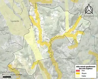 Le retrait-gonflement des sols argileux est susceptible d'engendrer des dommages importants aux bâtiments en cas d’alternance de périodes de sécheresse et de pluie. 15,8 % de la superficie communale est en aléa moyen ou fort (26,8 % au niveau départemental et 48,5 % au niveau national). Sur les 116 bâtiments dénombrés sur la commune en 2019, six sont en aléa moyen ou fort, soit 5 %, à comparer aux 36 % au niveau départemental et 54 % au niveau national. Une cartographie de l'exposition du territoire national au retrait gonflement des sols argileux est disponible sur le site du BRGM[15],[Carte 2].