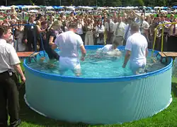 Le baptême a lieu en général lors des assemblées. Les candidats sont présentés à tous les participants, sous des applaudissements souvent nourris. Ils sont ensuite conduits dans une piscine, où on les baptise par immersion complète[23].