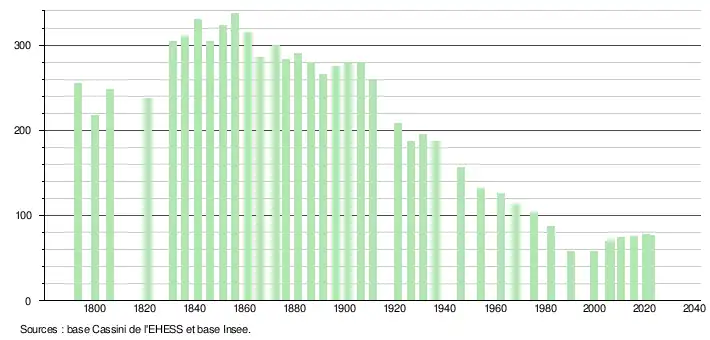 L'évolution du nombre d'habitants est connue à travers les recensements de la population effectués dans la commune depuis 1793. Pour les communes de moins de 10 000 habitants, une enquête de recensement portant sur toute la population est réalisée tous les cinq ans, les populations de référence des années intermédiaires étant quant à elles estimées par interpolation ou extrapolation[35]. Pour la commune, le premier recensement exhaustif entrant dans le cadre du nouveau dispositif a été réalisé en 2005[36].