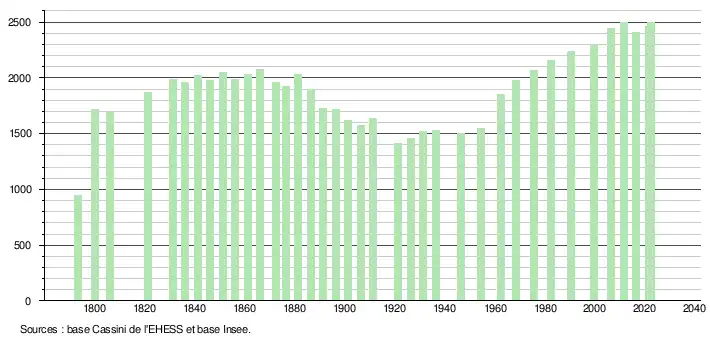 L'évolution du nombre d'habitants est connue à travers les recensements de la population effectués dans la commune depuis 1793. Pour les communes de moins de 10 000 habitants, une enquête de recensement portant sur toute la population est réalisée tous les cinq ans, les populations de référence des années intermédiaires étant quant à elles estimées par interpolation ou extrapolation[33]. Pour la commune, le premier recensement exhaustif entrant dans le cadre du nouveau dispositif a été réalisé en 2006[34].