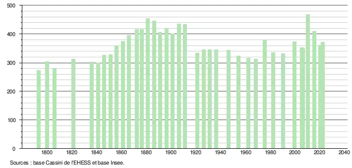 L'évolution du nombre d'habitants est connue à travers les recensements de la population effectués dans la commune depuis 1793. Pour les communes de moins de 10 000 habitants, une enquête de recensement portant sur toute la population est réalisée tous les cinq ans, les populations de référence des années intermédiaires étant quant à elles estimées par interpolation ou extrapolation[12]. Pour la commune, le premier recensement exhaustif entrant dans le cadre du nouveau dispositif a été réalisé en 2005[13].