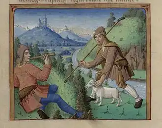 Ce chevrier spolié est un voisin jeune mais malade, qui mène son troupeau de chèvres sur le chemin de l'exil (v. 12-13). Malgré l'amertume et l'injustice de sa situation, il n'est pas jaloux de la chance de Tityre, seulement étonné de sa sérénité (v. 11) et curieux d'en connaître la raison[21]. S'il interrompt un moment sa marche pour déplorer le contraste de leurs destins[22], il lui serait trop douloureux de s'arrêter plus longtemps, et il poursuit son chemin.
