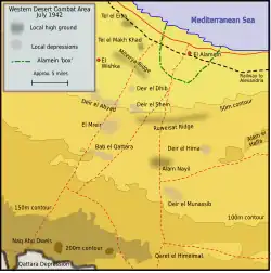 La limite sud de l’offensive est marquée par la dépression de Qattara qui était impraticable par les chars et la plupart des autres véhicules militaires en raison de ses caractéristiques spécifiques telles que la présence de lacs salés, de hautes falaises, d'escarpements et de fech-fech. Les falaises, en particulier, ont agi comme une muraille infranchissable, ce qui signifiait que la position britannique ne pouvait pas être débordée.