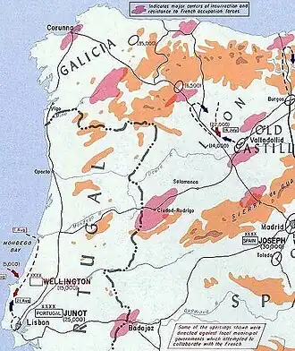 La situation en Espagne se dégrade encore quand Napoléon fait abdiquer le souverain espagnol pour installer son frère, Joseph Bonaparte sur le trône. Le 30 mai, l'insurrection espagnole atteint la Galice. Murat demande à Junot d'envoyer 6 000 hommes en renfort du général Dupont en Andalousie ; il n'en envoie que 2 500 mais commence à placer ses troupes avec des objectifs précis :