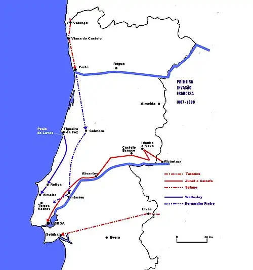 • (pt) Cet article est partiellement ou en totalité issu de l’article de Wikipédia en portugais intitulé « Primeira invasão francesa de Portugal » (voir la liste des auteurs).
