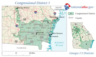 Le 1er district congressionnel de Géorgie est un district de l'État américain de Géorgie. Il est actuellement représenté par le Républicain Buddy Carter , bien que les limites du district aient été redessinées à la suite du recensement des États-Unis de 2010 , qui a accordé un siège supplémentaire à la Géorgie[1]. La première élection utilisant les nouvelles limites du district a été les élections au Congrès de 2012.