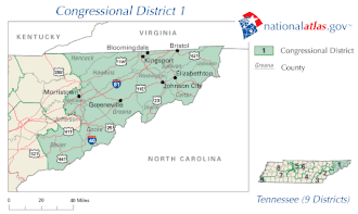 Les villes et villages représentés dans le district comprennent Blountville, Bristol, Church Hill, Elizabethton, Erwin, Gatlinburg, Greeneville, Johnson City, Jonesborough, Kingsport, Morristown, Mountain City, Newport, Pigeon Forge, Roan Mountain, Rogersville, Sneedville, Sevierville et Tusculum. Le 1er district à la Chambre des représentants des États-Unis est détenu par les républicains depuis 1881.