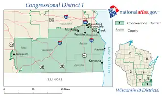 Le 1er district congressionnel du Wisconsin est un district situé dans le sud-est du Wisconsin, couvrant les comtés de Kenosha, Racine et la majeure partie du Comté de Walworth, ainsi que des parties du Comté de Rock et du Comté de Milwaukee. Le Représentant actuel du district est le Républicain Bryan Steil.