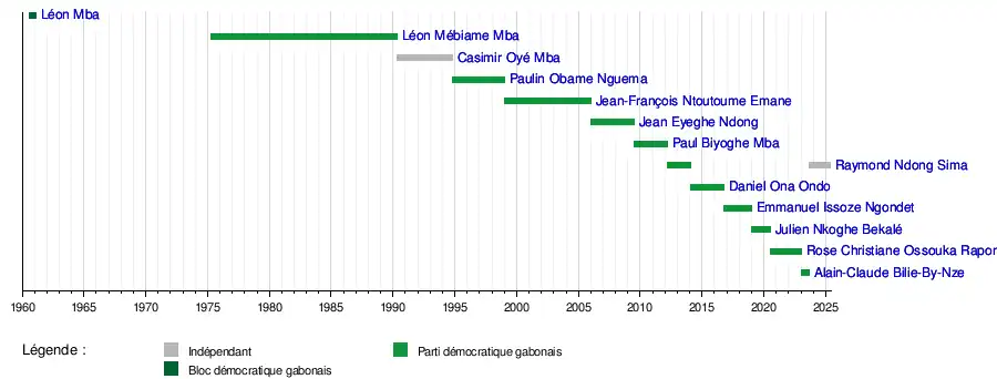 Le premier titulaire est Léon Mba de 1959 à 1961. Raymond Ndong Sima est le dernier à l'occuper, durant la période de transition qui suit le coup d'État de 2023, jusqu'à sa démission le .