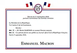 Décret nomination du Premier ministre Michel Barnier, 2024.