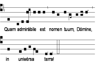 Cet exemple (Ps 8:2) est un bon résumé du premier mode : une superposition de trois teneurs sur ré, fa et la (formule ACB). L'intonation est typique du mode, ainsi que le phrasé qui retombe entre une teneur en la (premier et deuxième segment), puis en fa (troisième segment), pour revenir se poser sur le ré. Ici, le deuxième segment peut être vu comme une teneur d'attente sur le sol, de type interrogatif, attendant la conclusion sur le la final de Domine.
