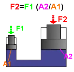 À une extrémité du système se trouve un piston avec une petite surface A1, de l'autre côté un piston avec une grande surface A2, qui permet d'accroître la force.