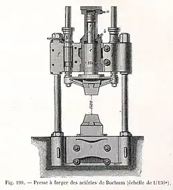 - les presses de forgeage libre, qui travaillent des lingots de plus en plus lourds (plusieurs centaines de tonnes) et gros, voient leur force stagner autour de 8 000 tonnes[14], atteignant occasionnellement 20 000 t[16], mais conservent des ouvertures impressionnantes (autour de 5 m). Depuis la disparition des blindages métalliques épais, elles sont destinées à la fabrication d'équipement industriel, dans les domaines de l'énergie nucléaire (où des lingots de 350 t sont courants[16]), de la chimie ou de la construction navale[14] ;