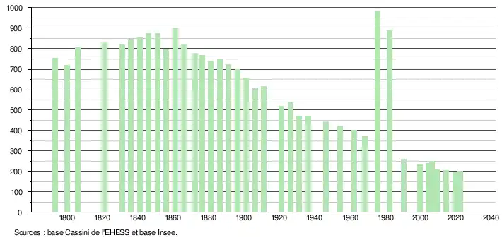 L'évolution du nombre d'habitants est connue à travers les recensements de la population effectués dans la commune depuis 1793. Pour les communes de moins de 10 000 habitants, une enquête de recensement portant sur toute la population est réalisée tous les cinq ans, les populations de référence des années intermédiaires étant quant à elles estimées par interpolation ou extrapolation[15]. Pour la commune, le premier recensement exhaustif entrant dans le cadre du nouveau dispositif a été réalisé en 2004[16].