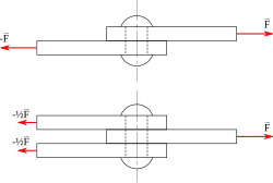 Dans le cas d'une conception rigoureuse, c'est la partie lisse de la vis qui est en contact avec les pièces ; dans le cas d'une vis épaulée, il y a un jeu minimal entre la partie lisse de la vis et le trou de passage, nous sommes alors dans le cas d'une pression diamétrale de pièces peu déformables « sans jeu ». D'après ce que l'on a vu précédemment, connaissant la pression admissible Padm du matériau, l'épaisseur t de la pièce et le diamètre d du boulon, la force maximale admissible Fb, Rd vaut, par boulon :