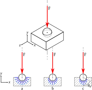 Comme pour le cas du contact cylindre-cylindre, si l'on considère que les pièces se déforment élastiquement mais que le jeu est négligeable, on obtient une répartition sinusoïdale des pressions[5],[11] :