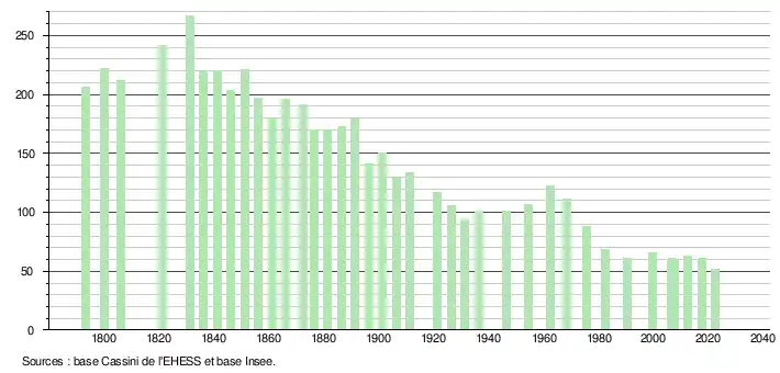 L'évolution du nombre d'habitants est connue à travers les recensements de la population effectués dans la commune depuis 1793. Pour les communes de moins de 10 000 habitants, une enquête de recensement portant sur toute la population est réalisée tous les cinq ans, les populations de référence des années intermédiaires étant quant à elles estimées par interpolation ou extrapolation[15]. Pour la commune, le premier recensement exhaustif entrant dans le cadre du nouveau dispositif a été réalisé en 2007[16].