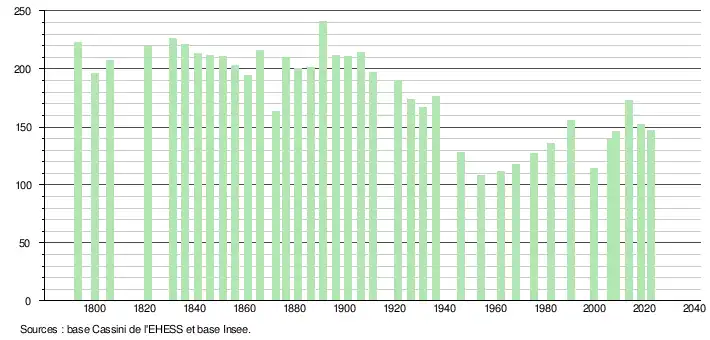 L'évolution du nombre d'habitants est connue à travers les recensements de la population effectués dans la commune depuis 1793. Pour les communes de moins de 10 000 habitants, une enquête de recensement portant sur toute la population est réalisée tous les cinq ans, les populations de référence des années intermédiaires étant quant à elles estimées par interpolation ou extrapolation[50]. Pour la commune, le premier recensement exhaustif entrant dans le cadre du nouveau dispositif a été réalisé en 2008[51].