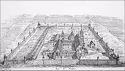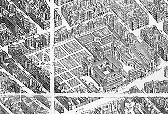 La construction d’un cloître dorique, entreprise en 1702 sur les plans de Pierre Bullet, s’achève en 1720. La plupart des bâtiments médiévaux sont remplacés de fur et à mesure, sous la direction de plusieurs architectes successifs. Nicolas Lhuillier de La Tour (ou Delatour)[24] qui succède à Pierre Bullet et fournit les plans des bâtiments conventuels en brique et pierre construits par l'entrepreneur Louis Le Tellier entre 1639 et 1641, puis François Soufflot le Romain qui a construit en 1786 le grand escalier. Le nouveau dortoir est terminé en 1742 sur les plans de Nicolas Lhuillier Delatour. En 1748, un moine du nom d'Hippolyte Le Faure, ou Le Fort, vend le secret de la fixation de l'or sur la porcelaine à la manufacture de Vincennes.
