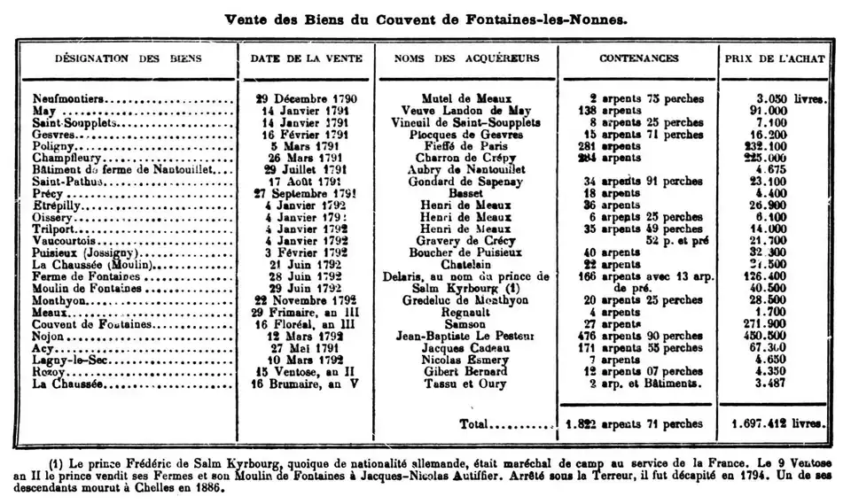 L'abbé Bonno ne cite pas toujours ses sources, mais c'est assurément à partir du cartulaire de Fontaines conservé aux Archives départementales de Seine-et-Marne qu'il a pu intégrer à son ouvrage la liste des religieuses de Fontaines présentée ci-dessous[24].