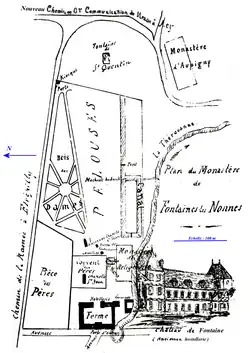 - ↑ Sur une vue aérienne du domaine, on peut voir la trace des fondations d'une partie de la maison claustrale.