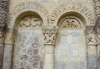 Cette arcature jumelle protège, à gauche, deux quadrupèdes, poitrine contre poitrine, possédant des ébauches d'ailes et se mordillant la queue. À droite, deux oiseaux boivent dans une même coupe. Les colombes buvant dans un calice sont une représentation des âmes qui boivent à la source de la mémoire. C'est un emprunt de l’Église à l'iconographie traditionnelle romaine. Pour un chrétien, cette image est le symbole de l'Eucharistie : « Vous puiserez l'eau avec joie aux sources du salut » (Isaïe, 12-3)[réf. incomplète]. Elle est courante dans les églises romanes du département de la Vienne. On la retrouve à l'église Saint-Pierre de Chauvigny, à l'église de Bonneuil-Matours, à l'église de Civaux, à celle de Liniers et à l'église Saint-Hilaire de Melle (département des Deux-Sèvres).