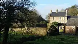 L'enceinte a disparu à l'ouest et au nord. Des douves en eau baigne le sud et le nord de la propriété. L'accès à la ferme se fait par une porte à pont dormant qui remplace l'ancien levis. L'écusson armorié[6] d'Arthur de Cossé qui ornait la porte a été donné au musée d'Avranches par M. Maillard-Lacavée en 1845. La porte du manoir, plus à ouest, est une porte cochère et piétonne à pont dormant.