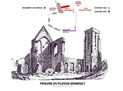 En 1830, quand Arcisse de Caumont arrive sur la colline du Plessis, il aperçoit l'église avec transept se terminant par une abside. Plusieurs colonnettes ont des chapiteaux qui annoncent le XIIIe siècle. La tour ne parait pas aussi ancienne que le chœur. La plateforme doit avoir remplacé une pyramide de charpente. On voit encore tout le côté oriental des bâtiments qui bordent la cour du cloître. La salle capitulaire a été réduite et semble se terminer à l'est par une espèce d'abside. Deux portes s'ouvrent sur la galerie du cloître, les chapiteaux des colonnes sont de la fin du XIVe ou du XVe siècle. Dans les autres pièces du rez-de-chaussée, les colonnes à huit pans ont des chapiteaux qui sont peut-être du XIVe. On voit une belle cheminée dans une pièce que l'on croit être la cuisine. Des jardins et plus loin des étangs se trouvent à l'est. À l'ouest de la cour extérieure du prieuré, le portail semble du XIIIe ou du XIVe siècle[7].
