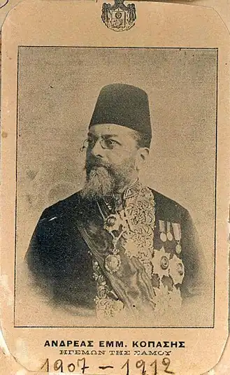 L'île de Sámos participe activement à la guerre d'indépendance grecque et résiste aux tentatives d'invasion égyptienne et ottomane. Cependant, une fois l'indépendance de la Grèce reconnue, en 1832, l'île n'est pas incluse dans le nouvel État hellène. En 1834, l'île reçoit, en compensation, son autonomie sous la suzeraineté du sultan ottoman.
