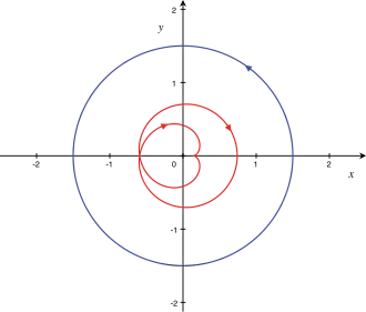 - l'autre cas est : , alors l'indice des deux zéros est égal à 1 et l'image du lacet par tourne deux fois autour de l'origine en effet :